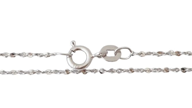 Drobný stříbrný řetízek má očkové zapínání a je povrchově upraven rhodiováním. Rhodium patří mezi drahé kovy, patřící do skupiny platinových a chrání stříbro před černáním, zvyšuje lesk řetízku.