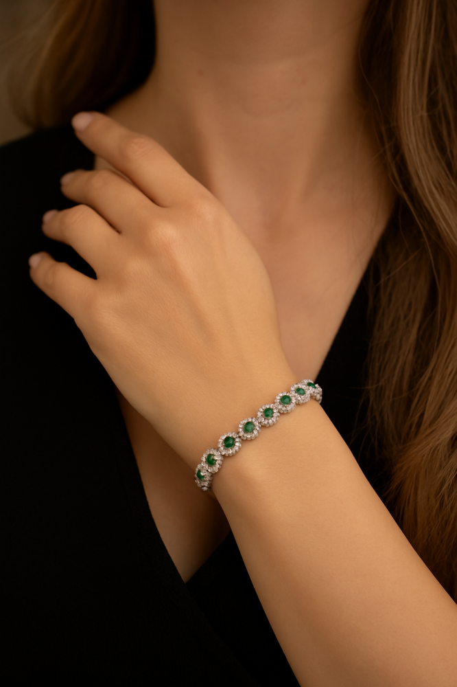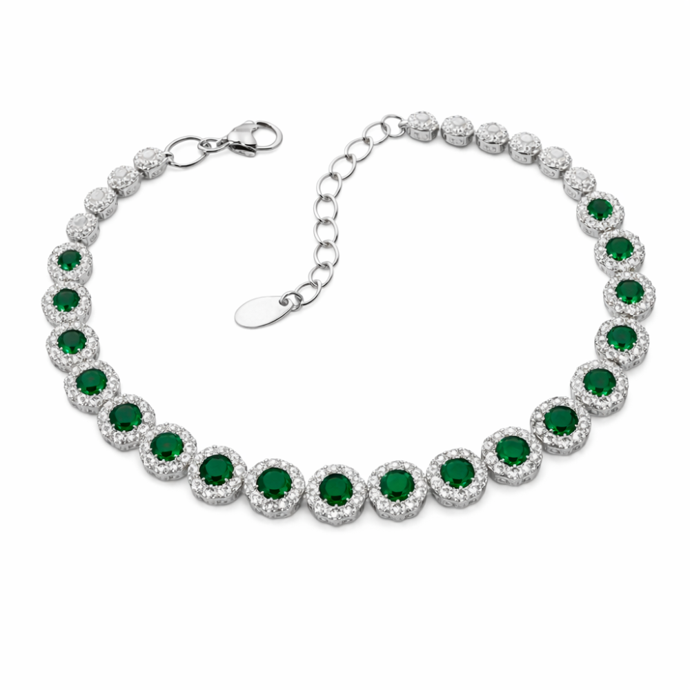Tento elegantní stříbrný náramek vás okouzlí svým sofistikovaným designem a výraznými zelenými zirkony, které vynikají v nádherném kontrastu s jemně strukturovanými stříbrnými obrubami. Vyroben je z kvalitního stříbra 925/1000, které zaručuje vysoký lesk, pevnost a dlouhou životnost. Je to šperk, který rozzáří každý váš okamžik..