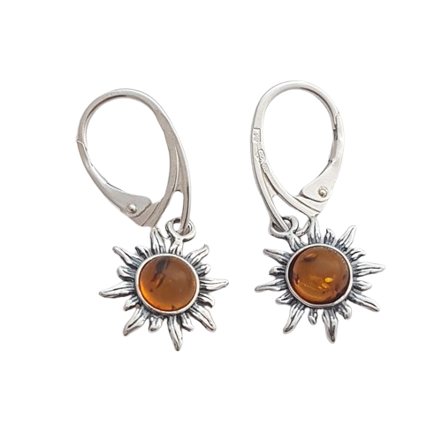 Tyto stříbrné náušnice s jantarem zaujmou dynamickým slunečním motivem a silnou symbolikou. Kulatý přírodní jantar v hřejivém koňakovém odstínu je zasazen do plasticky tvarovaného stříbra připomínajícího sluneční paprsky, které šperku dodávají energii a výraz.