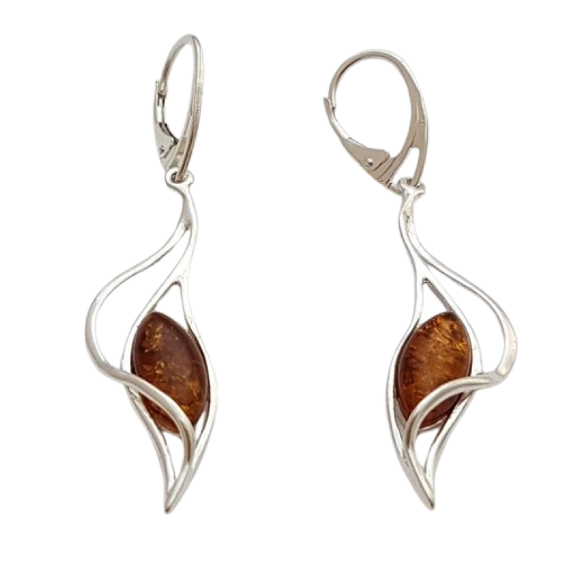 Přírodní jantar v medově-koňakovém odstínu má jedinečnou kresbu, a proto je každý pár náušnic originálem. Jemný kontrast mezi hladkým kamenem a ladně prohnutým stříbrem dodává šperku moderní, přesto nadčasový výraz.