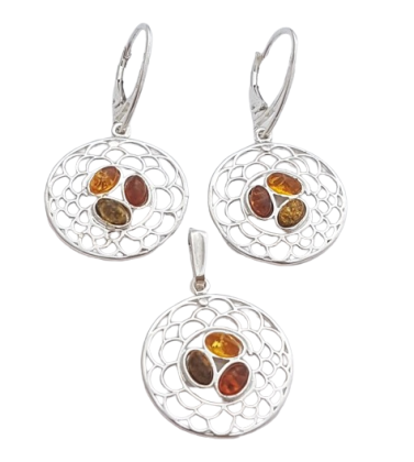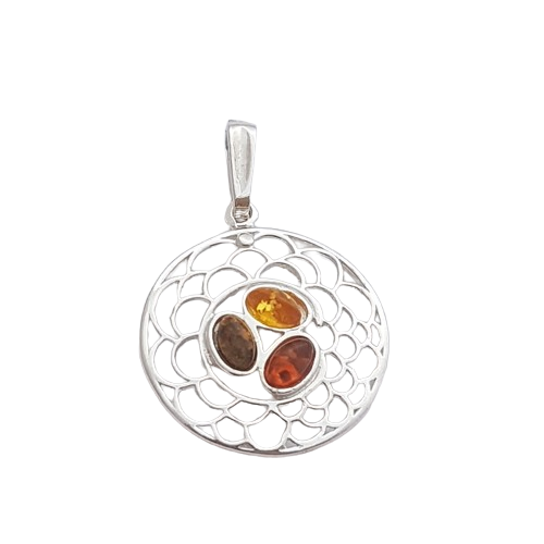 Ve středu kruhu se setkávají drobné kousky přírodního jantaru v různých odstínech – medový, koňakový i tmavší tón. Každý kámen přináší jiný odlesk a hloubku, společně ale tvoří harmonický celek. Jantar zde nepůsobí dominantně, spíše jako tiché světlo ukotvené v jemné kresbě stříbra.