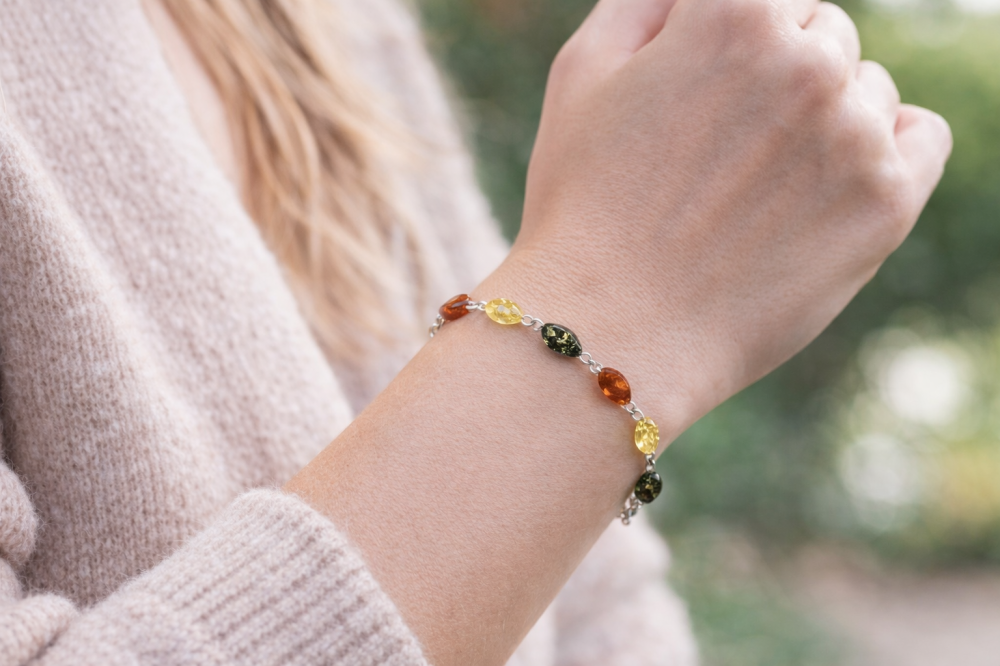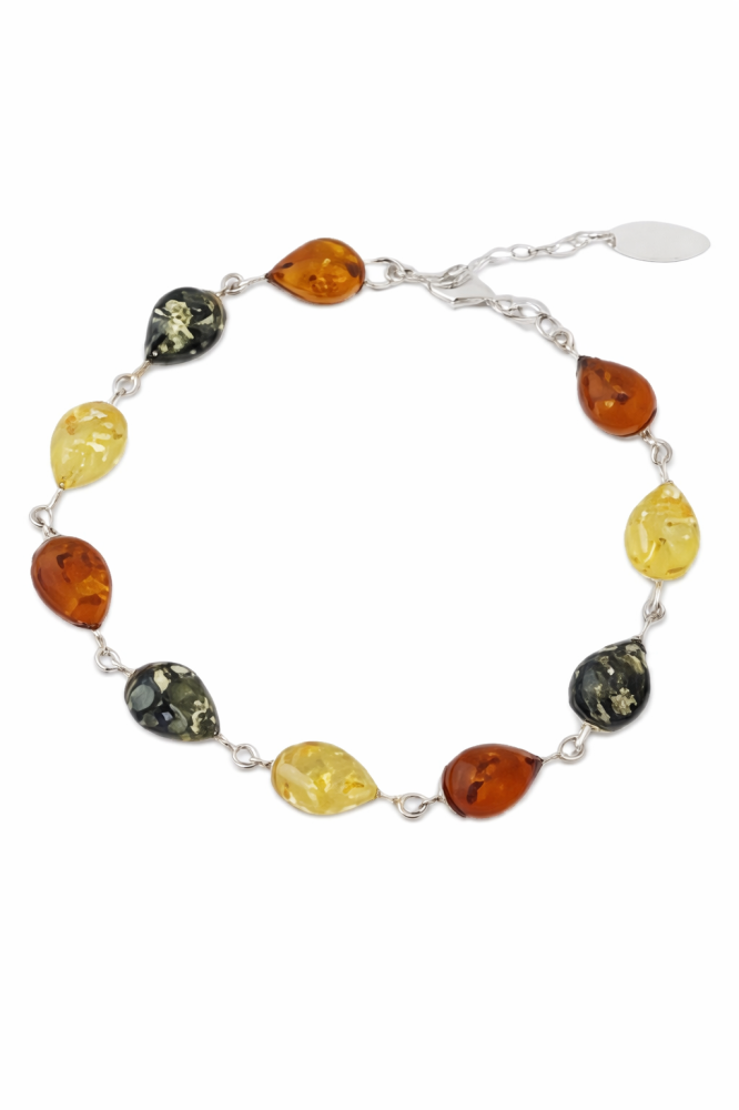 Nechte se okouzlit jemností a přirozenou krásou jantarového náramku ze stříbra 925/1000, který je zdoben kapkovitými kameny z přírodního jantaru. Teplé odstíny medové, citronové, koňakové i tmavší zelené barvy vytvářejí harmonickou kompozici, jež působí lehce, elegantně a nadčasově.