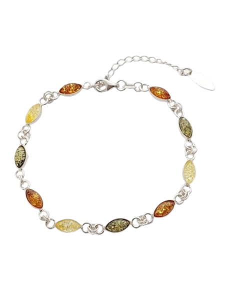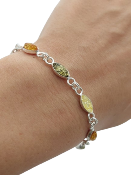 Oválné jantarové kameny v různých přírodních odstínech – zlatavém, medovém a jemně zelenkavém – jsou zasazeny do hladkých lůžek ze stříbra ryzosti 925/1000 a propojeny do lehké, pravidelné linie. Jantar zachycuje světlo a dodává náramku teplo i přirozený lesk, který krásně vyniká na pokožce.