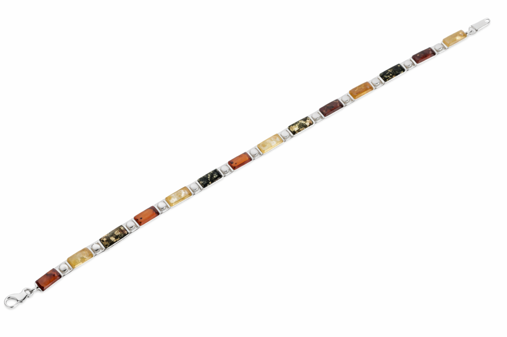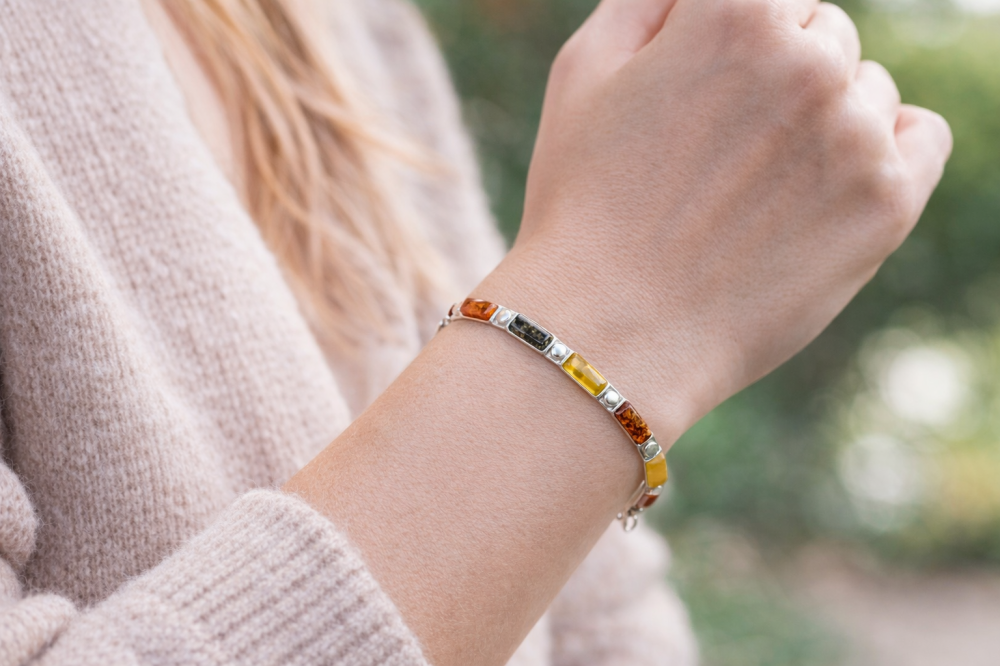 Objevte jedinečný jantarový náramek ze stříbra 925/1000, který v sobě nese harmonii přírody, eleganci a nadčasový design. Každý kámen je vyroben z přírodního jantaru, jehož teplé medové, koňakové a tmavší odstíny vytvářejí jemnou, přirozenou mozaiku barev. Díky tomu je každý náramek originál – žádné dva nejsou zcela stejné.