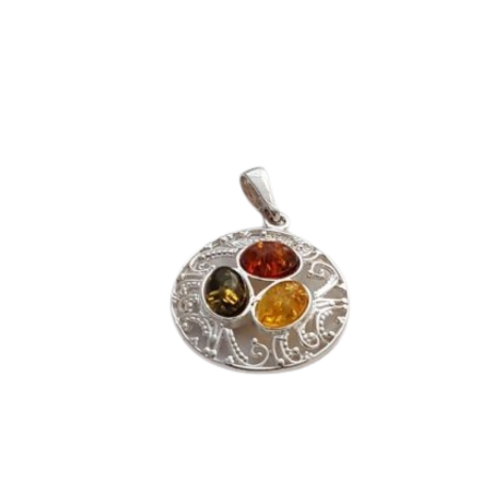 Tento stříbrný přívěsek s jantarem v kruhovém provedení je elegantním symbolem harmonie, celistvosti a pozitivní energie. Precizně zpracované stříbro ryzosti 925/1000 tvoří jemně zdobený kruh, v jehož středu se setkávají tři jantarové kameny v různých odstínech – každý s vlastním charakterem a teplem.