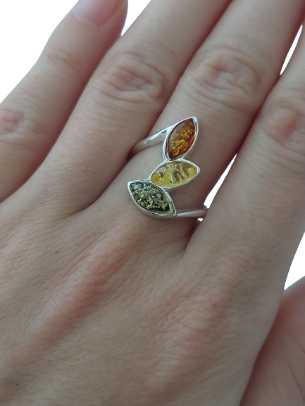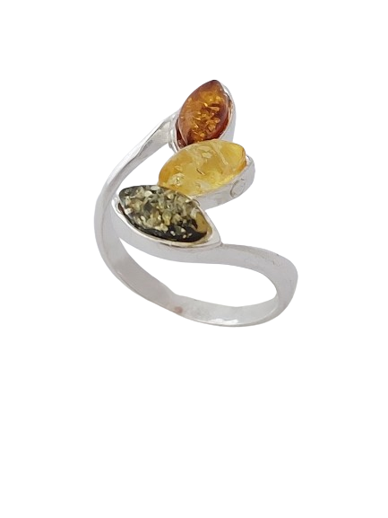 Tento stříbrný prsten s tříbarevným jantarem okouzlí svým plynulým, téměř tanečním tvarem, který jemně obtáčí prst. Precizně zpracované stříbro ryzosti 925/1000 vytváří lehkou, otevřenou linii, v níž se postupně setkávají tři jantarové kameny v rozdílných odstínech.