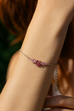 Jednoduchý, ale magicky efektní design doplňuje tenký stříbrný řetízek, který zajišťuje lehkost a pohodlí při nošení. Nastavitelné zapínání umožňuje perfektní přizpůsobení velikosti, takže náramek sedí na ruce přesně tak, jak má. Růžové zirkony odrážejí světlo s jemným třpytem a připomínají krásu skutečných drahokamů.