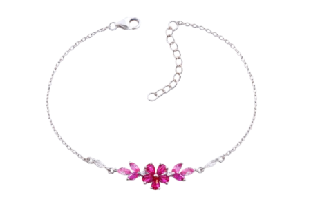 Objevte kouzlo něžné elegance s tímto mimořádně působivým stříbrným náramkem z pravého stříbra 925/1000, který je zdobený zářivými růžovými zirkony usazenými do romantického květinového motivu. Kombinace jemných marquise a kulatých kamenů vytváří harmonickou souhru barev a tvarů, díky níž náramek působí velmi žensky, svěže a luxusně zároveň.