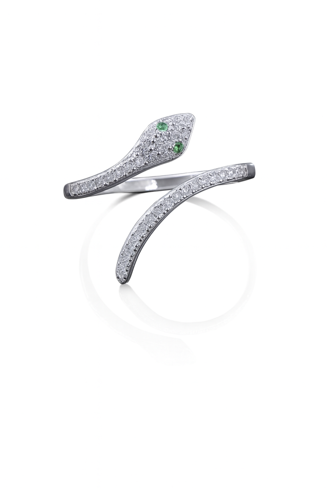 Tento sofistikovaný hadí prsten je vyroben ze stříbra ryzosti 925/1000 a představuje ideální spojení precizního zpracování a jemného, moderního designu. Tělo hada je bohatě osazeno čirými zirkony, které prstenu dodávají intenzivní třpyt a lehkost. Hlava je zvýrazněna dvěma zelenými zirkony, jež vytvářejí dojem živých, pronikavých očí a dodávají šperku jedinečný charakter.