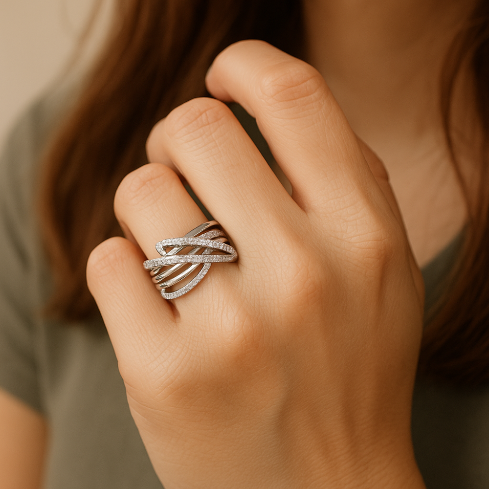 Díky modernímu kříženému tvaru prsten krásně obepne prst a vytváří efekt vrstvení, aniž by působil těžkým dojmem. Zirkony vysoké kvality dodávají šperku jemnou jiskru, kterou oceníte při denním i umělém světle. Tento kousek je ideální volbou pro ženy, které milují elegantní nadčasové šperky a chtějí originální prsten vhodný jak pro běžné nošení, tak pro slavnostní příležitosti.