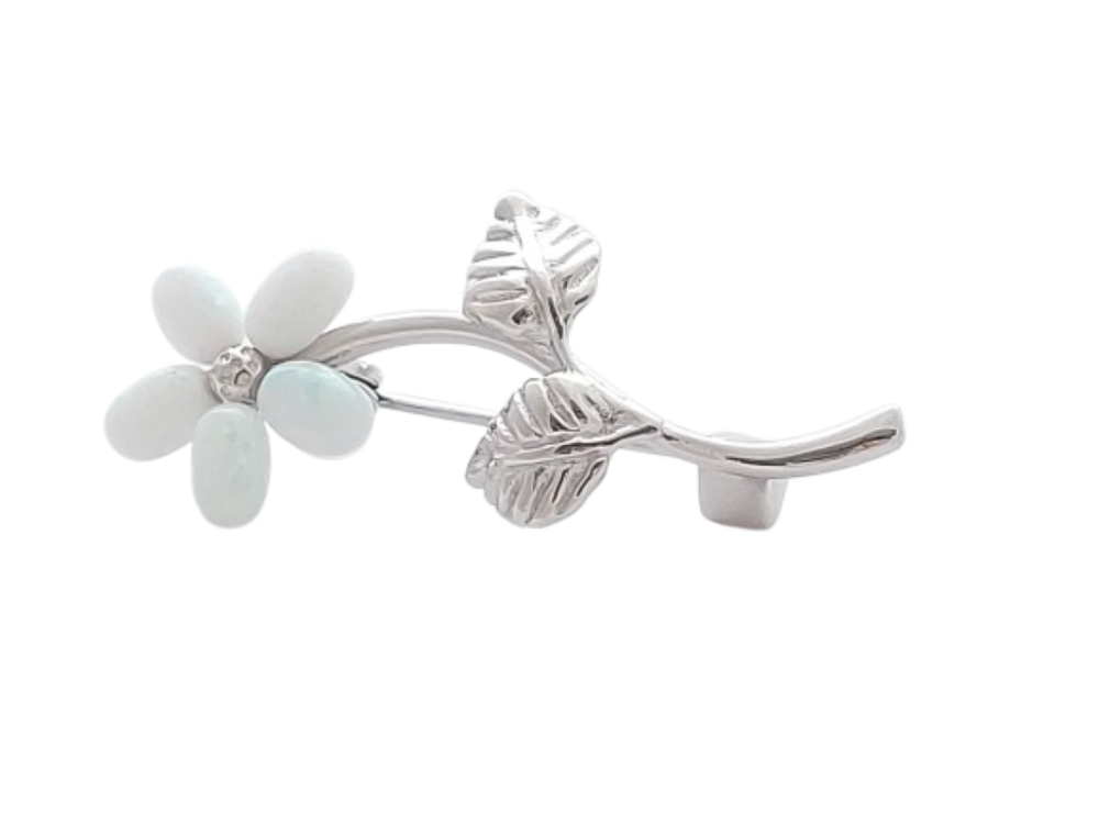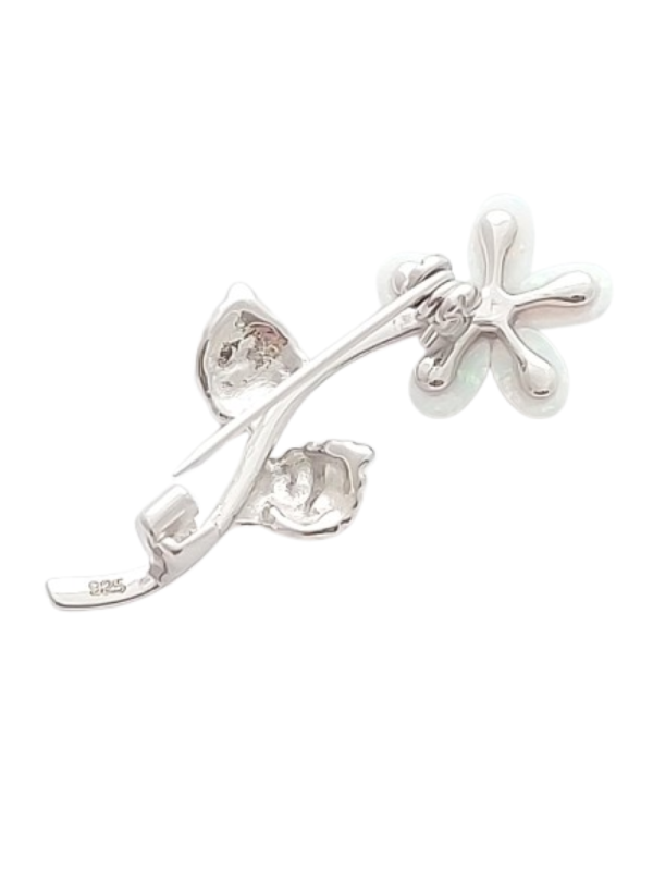 Tato stříbrná brož ze stříbra 925/1000 zaujme svým něžným květinovým motivem a propracovanými detaily listů. Světlé opalizující kameny v podobě okvětních lístků dodávají šperku jemný lesk a lehkost, která působí velmi elegantně a přirozeně.