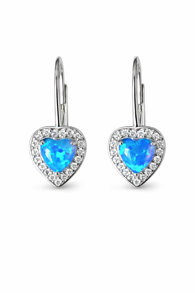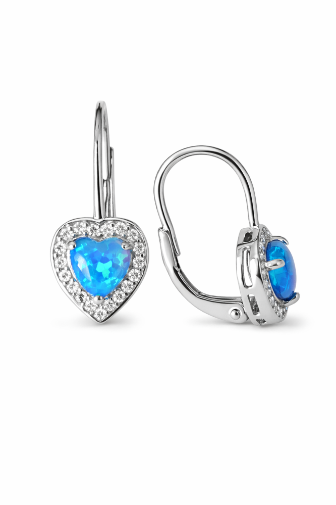 Tyto stříbrné náušnice ze stříbra ryzosti 925/1000 v sobě spojují romantický motiv s nadčasovou elegancí. Středem šperku je modrý opál ve tvaru srdce, jehož sytá barva a jemná struktura připomínají klidnou hladinu moře a dodávají náušnicím hloubku i emoci.