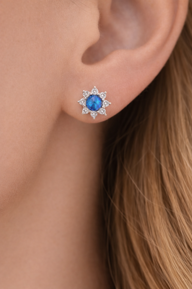 Sytější modrý tón opálu působí svěže a elegantně, zatímco čiré zirkony zvýrazňují jeho barvu a dodávají náušnicím slavnostnější nádech. Díky menšímu, kompaktnímu provedení jsou náušnice velmi pohodlné na nošení a skvěle se hodí pro každodenní použití i jako decentní doplněk ke slavnostnějším outfitům.