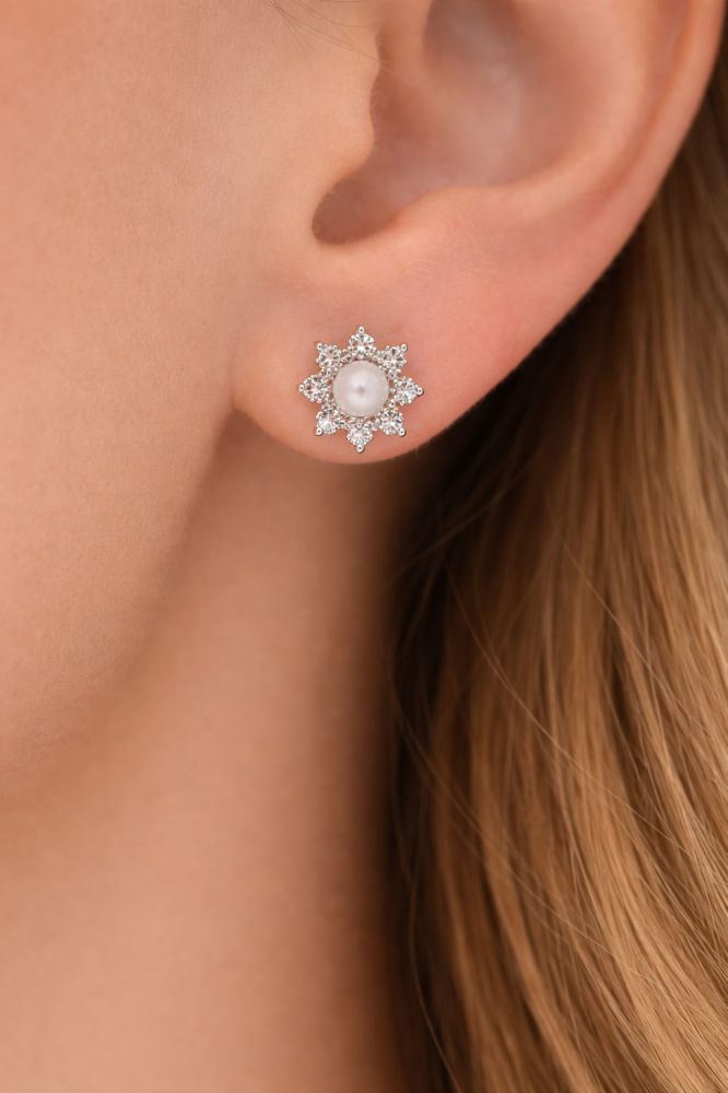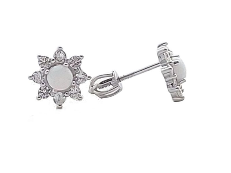 Tyto stříbrné náušnice ze stříbra 925/1000 zaujmou svým jemným květinovým motivem a harmonickým spojením bílého opálu a čirých zirkonů. Středový bílý opál s decentním opalescentním leskem je obklopen drobnými zirkony, které šperku dodávají jemný třpyt a elegantní vzhled.