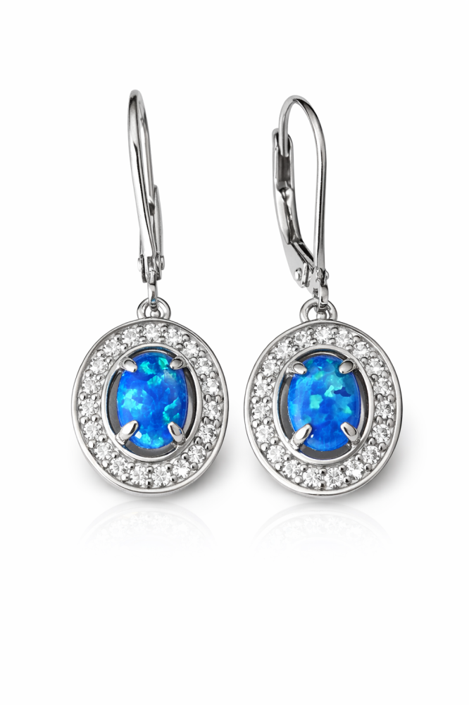Tyto stříbrné náušnice ze stříbra ryzosti 925/1000 představují harmonické spojení klasické elegance a jemného třpytu. Dominantou šperku je oválný modrý opál, jehož sytá barva a přirozená struktura připomínají klidnou hloubku moře a dodávají náušnicím osobitý charakter.