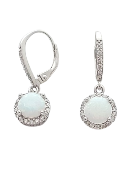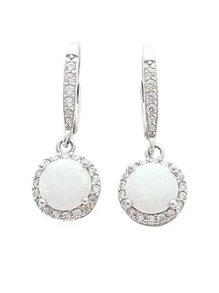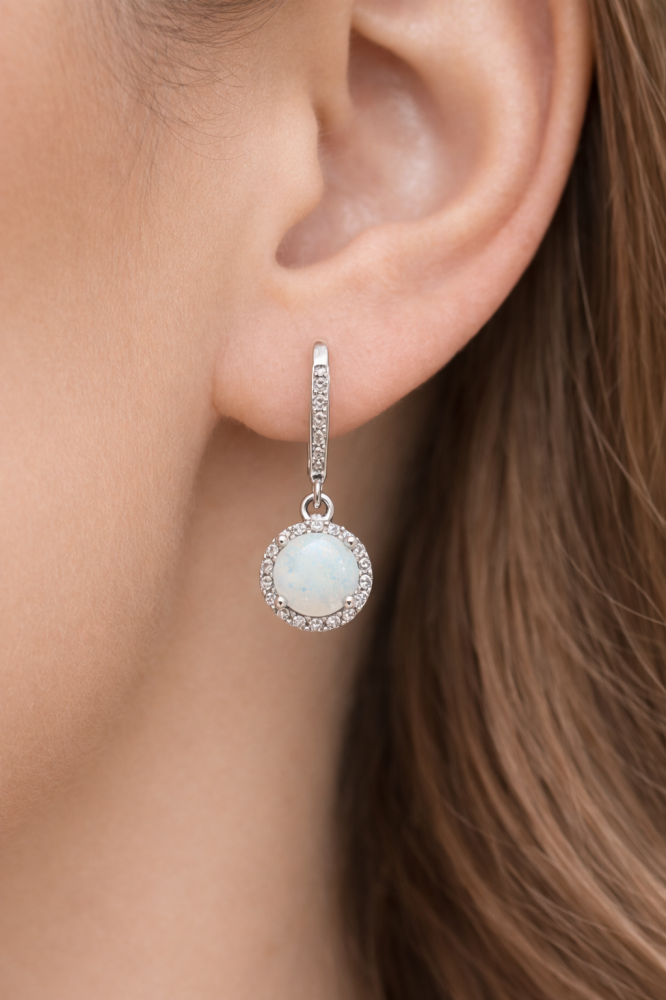 Tyto visací náušnice jsou vyrobeny ze stříbra ryzosti 925/1000 a zdobeny bílým opálem, který okouzlí svým mléčným odstínem a jemnou hrou světla. Centrální opál je obklopen čirými zirkony, jež dodávají šperku decentní třpyt a luxusní vzhled.