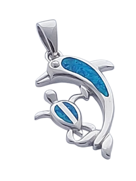 Tento originální přívěsek je vyroben ze stříbra ryzosti 925/1000 a zdoben modrým opálem, který okouzlí svou sytou barvou a jemnou hrou světla. Motiv delfína a želvy vytváří harmonické spojení dvou silných symbolů spojených s vodním živlem.