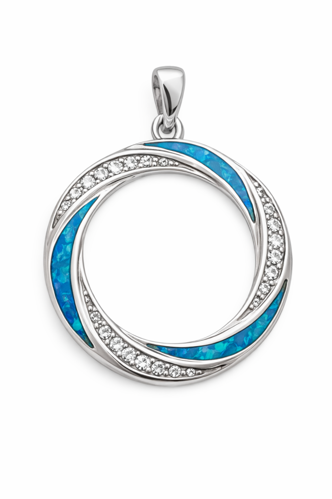 Tento elegantní stříbrný přívěsek v podobě většího propleteného kruhu zaujme svým výrazným designem, vyšší hmotností a precizním zpracováním. Kombinace zářivého modrého opálu a třpytivých zirkonů dodává šperku luxusní vzhled a hloubku.