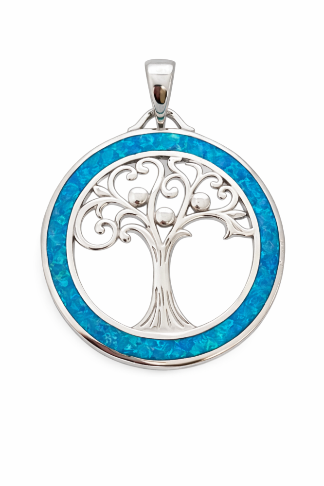 Strom života je od pradávna symbolem síly, růstu, stability a propojení s kořeny, zatímco kruh představuje nekonečno a harmonii. Modrý opál dodává šperku klidnou, ochrannou energii a podtrhuje jeho význam jako osobního talismanu.
