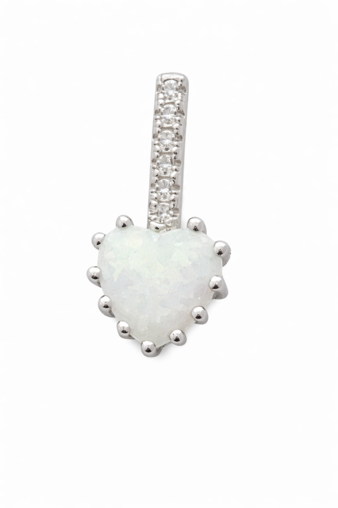 Tento něžný stříbrný přívěsek ve tvaru srdce je zdoben jemně duhovým bílým opálem, který je uchycen v decentní obrubě, a doplněn o třpytivé zirkony na závěsu. Srdce je nadčasovým symbolem lásky, citu a blízkosti, zatímco bílý opál představuje čistotu, harmonii a pozitivní energii.