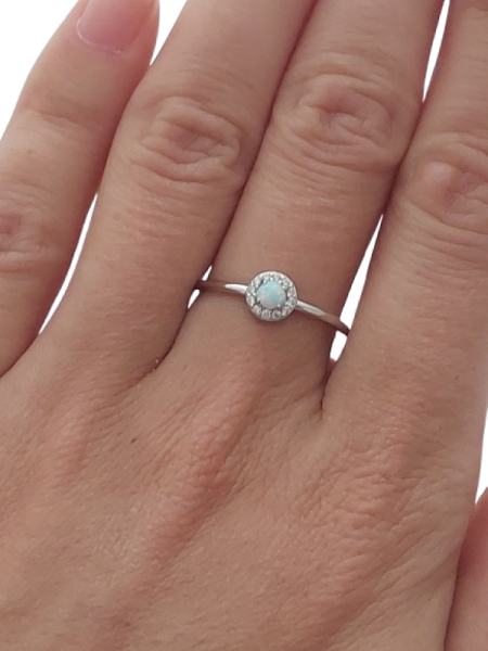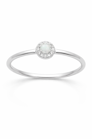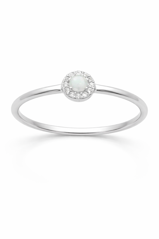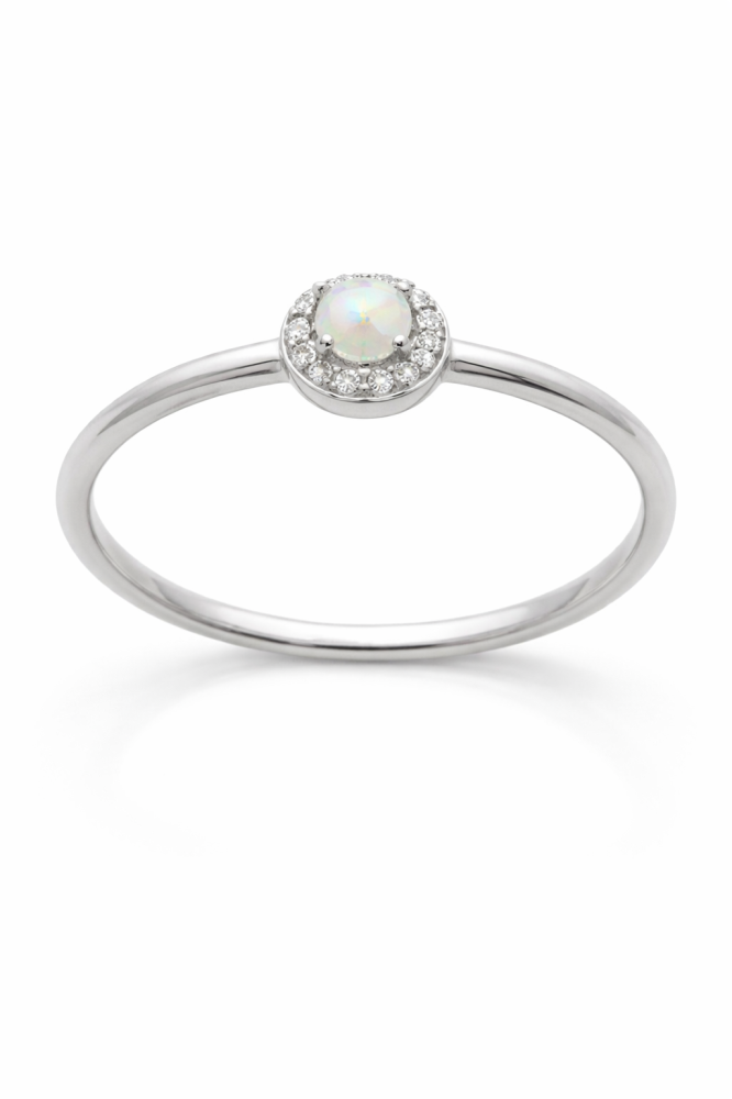 Opál odráží světlo v decentních odstínech zelené, růžové a zlatavé barvy, díky čemuž působí velmi něžně a romanticky. Lem zirkonů dodává prstenu jemný luxusní třpyt, aniž by narušil jeho minimalistický charakter.
