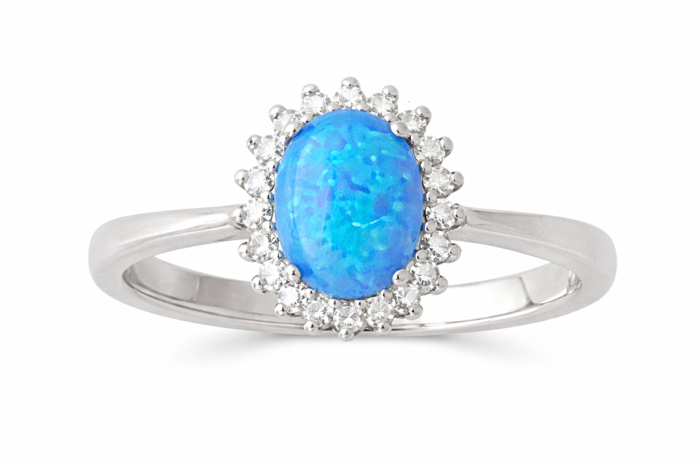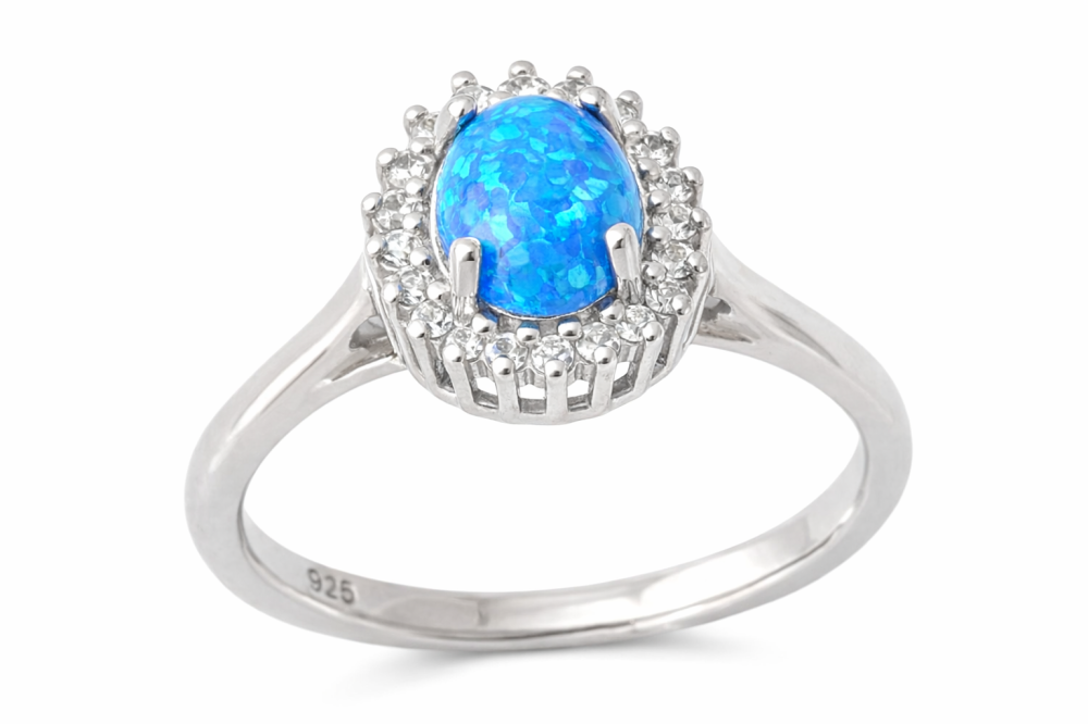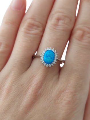 Dominantou prstenu je oválný modrý opál, jehož fascinující barevná hra se mění při každém pohybu ruky. Od jemných tyrkysových tónů až po sytější modré odlesky – každý pohled na něj je jedinečný. Opál je obklopen drobnými zirkony, které vytvářejí zářivý rám a dodávají šperku luxusní vzhled.
