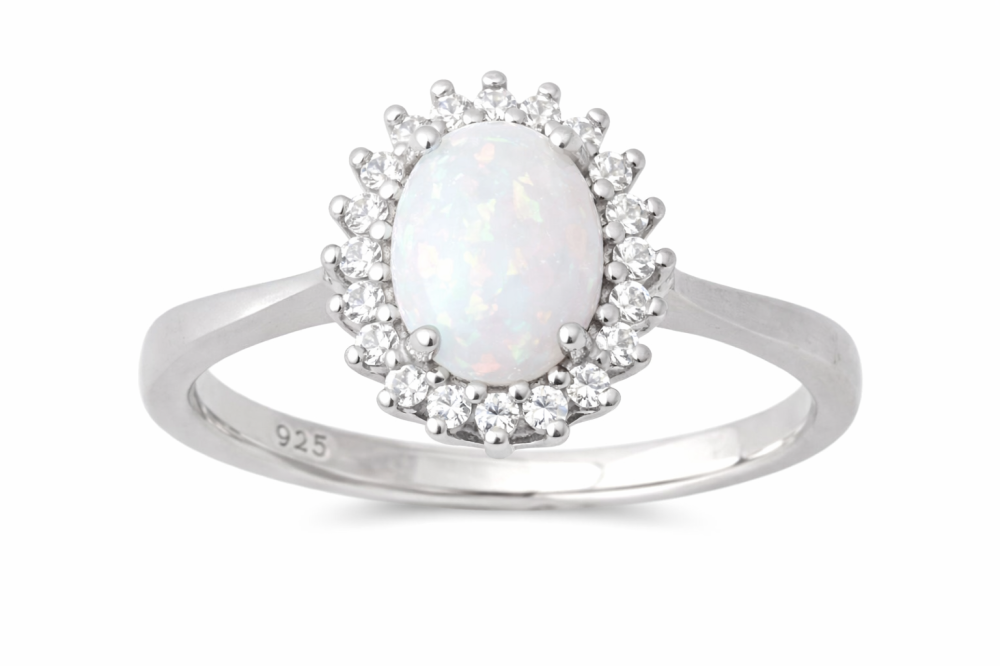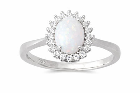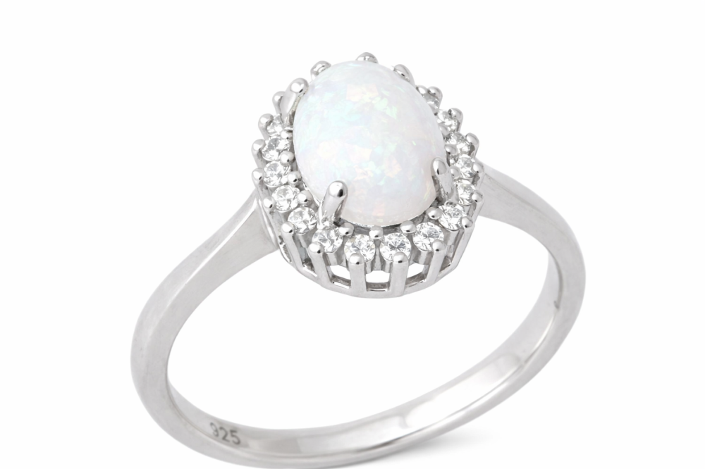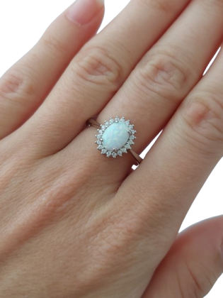 Dominantou prstenu je oválný bílý opál s mléčně perleťovým leskem, který se při dopadu světla jemně proměňuje a odhaluje své něžné odlesky. Kolem něj je precizně osazený věneček zirkonů, které dodávají šperku jiskru a zvýrazňují jeho sofistikovaný design.
