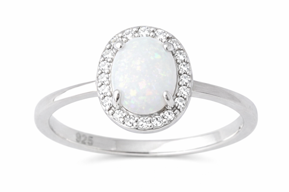 Dominantou prstenu je bílý opál s charakteristickým mléčným až perleťovým leskem, který se při dopadu světla jemně proměňuje. Jeho klidná a čistá barva působí velmi sofistikovaně a snadno se kombinuje s dalšími šperky i různými styly oblékání. Opál je lemován drobnými zirkony, které dodávají prstenu jemný třpyt a zvýrazňují jeho elegantní tvar.