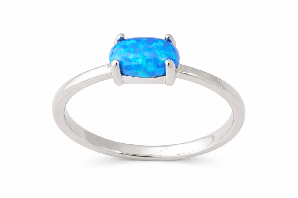 Tento stříbrný prsten s oválným modrým opálem sází na čistý design a přirozenou krásu kamene. Bez zbytečného zdobení nechává plně vyniknout syté odstíny modré, které se při dopadu světla jemně proměňují od tyrkysové až po hlubší oceánské tóny.