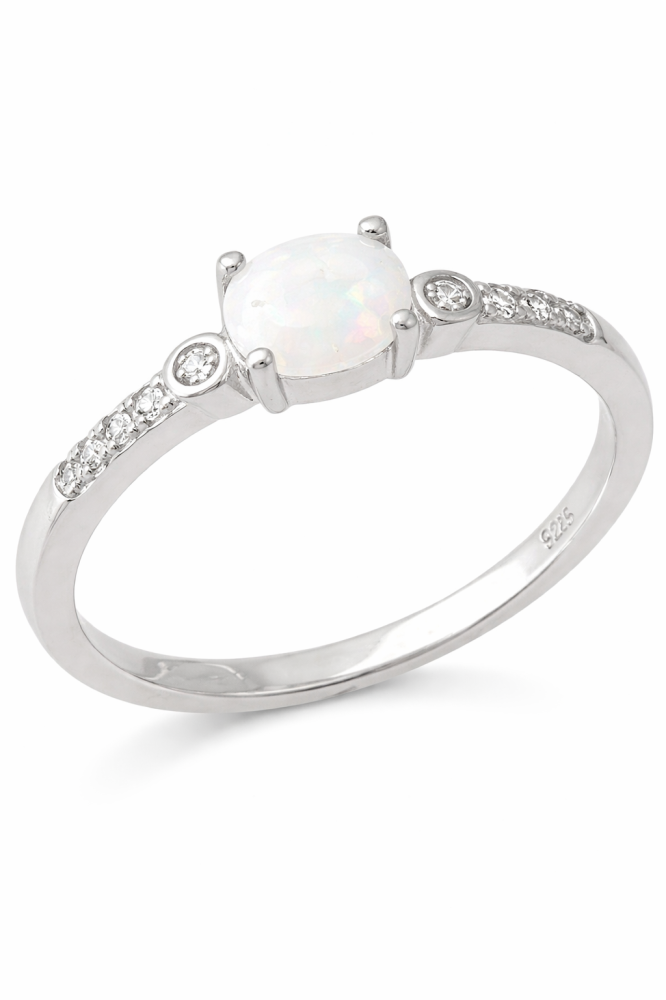 Dominantou prstenu je kulatý bílý opál, jehož jemná hra barev vytváří při dopadu světla nenápadný, ale okouzlující efekt. Opál je uchycen v hladkém lůžku, které zvýrazňuje jeho přirozenou krásu a čistý vzhled.