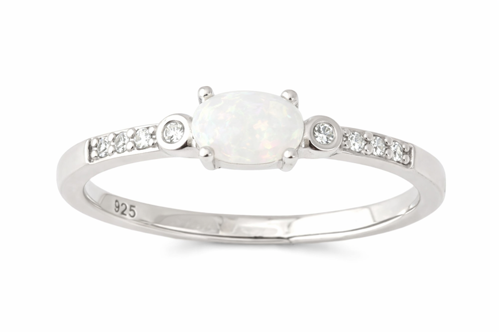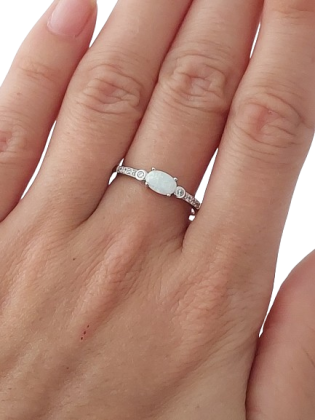 Po stranách prstenu jsou vsazeny drobné zirkony, které dodávají šperku jemný třpyt a vytvářejí vyvážený design. Díky kombinaci opálu a zirkonů působí prsten velmi elegantně a snadno se kombinuje s dalšími doplňky.