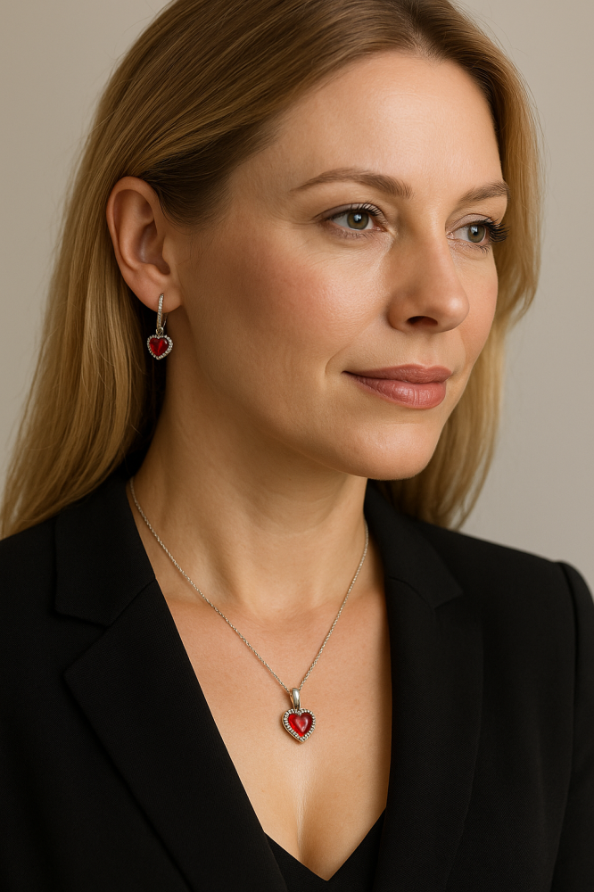 Zářivá sada šperků s červeným srdcem představuje dokonalou rovnováhu mezi elegancí, vášní a jemností.