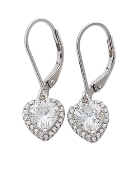 Každý kousek – stříbrný náhrdelník i náušnice – zdobí zářivý čirý zirkon ve tvaru srdce, orámovaný drobnými kamínky, které dokonale odrážejí světlo.