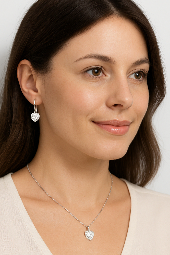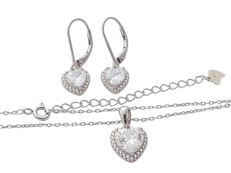 Tato stříbrná sada šperků s čirým srdcem se snadno kombinuje, nikdy nevyjde z módy a dodá vašemu vzhledu jemný dotek luxusu.