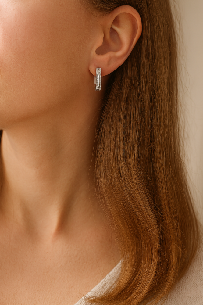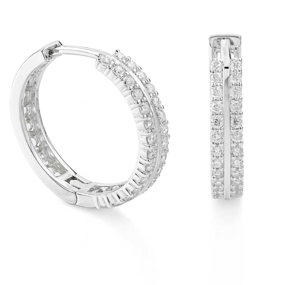 Tyto okouzlující stříbrné kroužkové náušnice vynikají dvojitou linií precizně osazených čirých zirkonů, které vytvářejí intenzivní jiskru při každém pohybu. Jejich design kombinuje klasický tvar kruhu s moderní elegancí, zatímco dokonale propracované uchycení kamenů zajišťuje maximální lesk a dlouhou životnost.