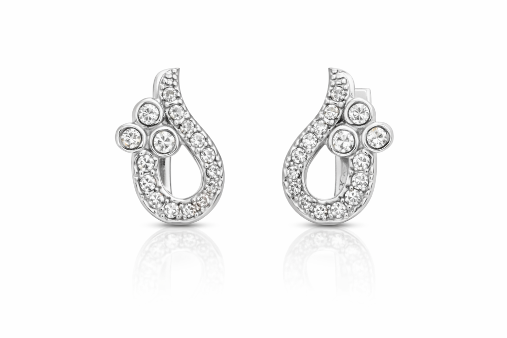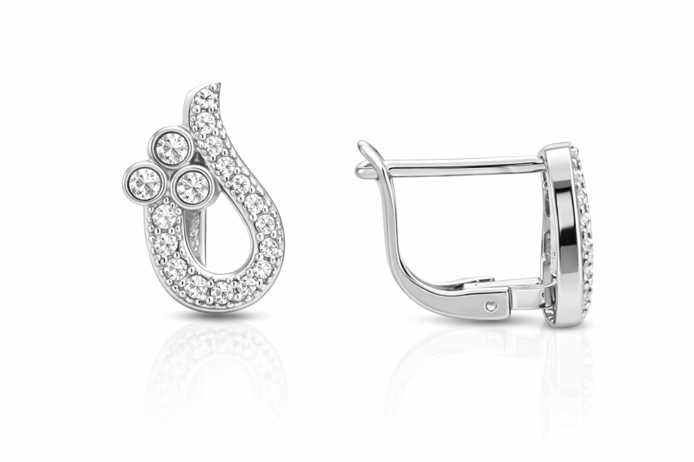 Tyto stříbrné náušnice s čirými zirkony zaujmou svým jemným, organickým tvarem a bohatým, ale stále velmi vkusným třpytem. Kombinace drobných čirých zirkonů vytváří harmonický celek, který krásně odráží světlo a působí elegantně z každého úhlu.