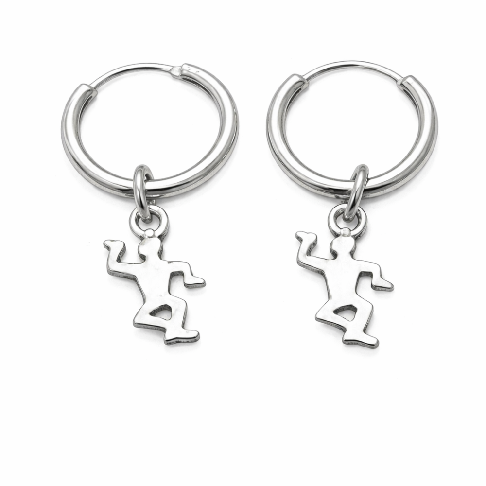 Tyto stříbrné náušnice ryzosti 925/1000 v podobě jemných kroužků s přívěskem tanečníka jsou krásným vyjádřením lehkosti, rytmu a životní energie.