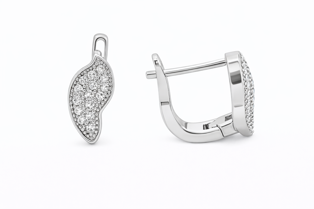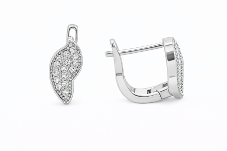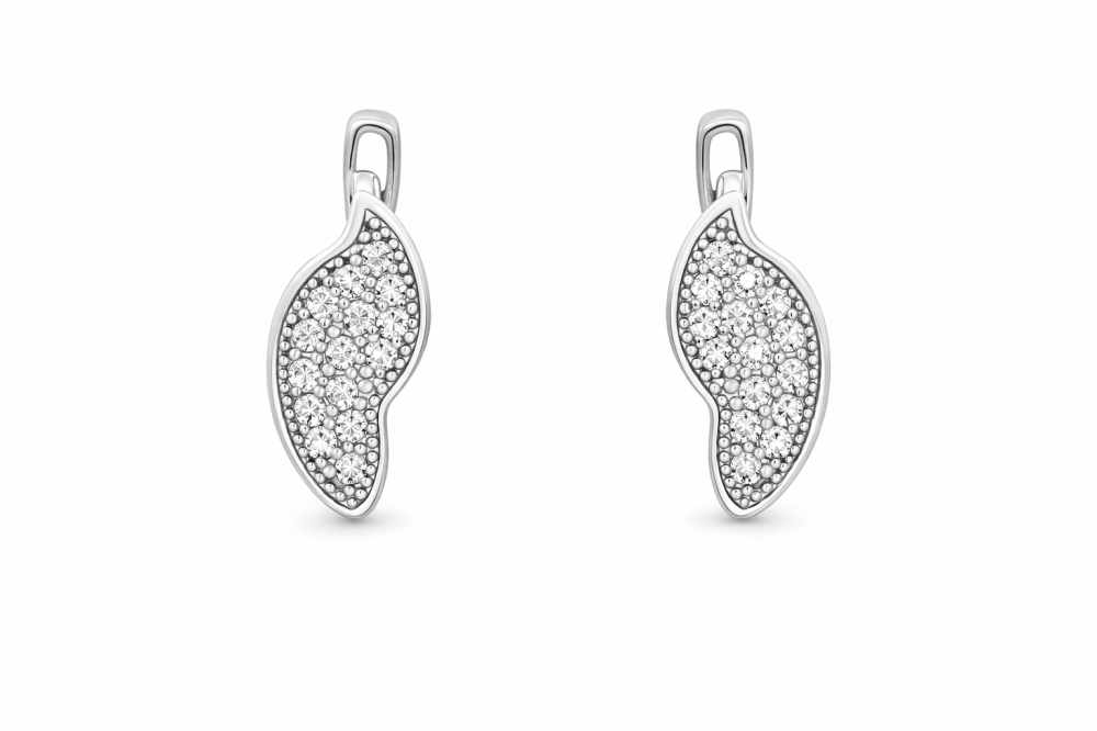 Jemně tvarované křídlo je osazeno drobounkými čirými zirkony, které vytvářejí souvislý, elegantní třpyt připomínající diamantový povrch. Precizní osazení dodává náušnicím luxusní vzhled, přesto působí lehce a velmi přirozeně.