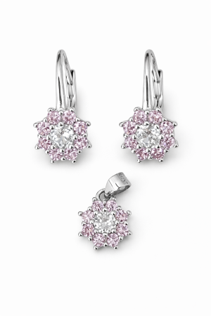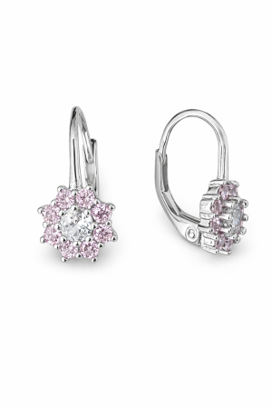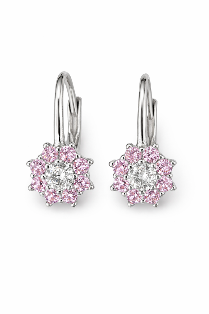 Tyto stříbrné náušnice ve tvaru růžové kytičky okouzlí svou jemností a romantickým vzhledem. Květinový motiv je osazen růžovými zirkony, které vytvářejí krásný třpyt a dodávají šperku svěží, ženský nádech.