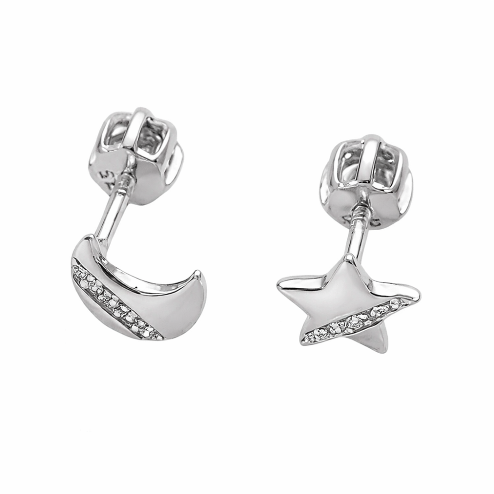 Tyto jemné stříbrné náušnice ve tvaru měsíce a hvězdy představují harmonické spojení symboliky a elegance. Jsou vyrobeny z kvalitního stříbra ryzosti 925/1000 a osazeny drobnými čirými zirkony, které dodávají šperku decentní třpyt.