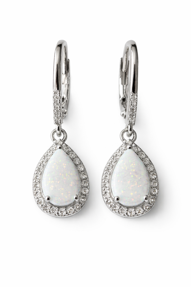 Tyto stříbrné náušnice z kvalitního stříbra 925/1000 zdobí jemný bílý opál ve tvaru kapky – symbol čistoty, elegance a ženské jemnosti. Jeho duhová hra barev odhaluje při každém pohybu jemné odlesky růžové, zelené i zlaté.