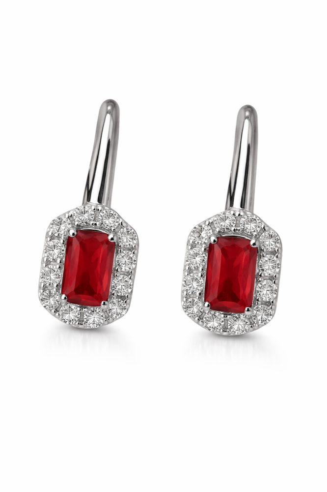 Tyto stříbrné náušnice ze stříbra ryzosti 925/1000 zaujmou na první pohled svým sofistikovaným designem a výraznou barevností. Dominantní červený zirkon v obdélníkovém brusu je elegantně orámován drobnými čirými zirkony, které náušnicím dodávají luxusní lesk a jemnou noblesu.