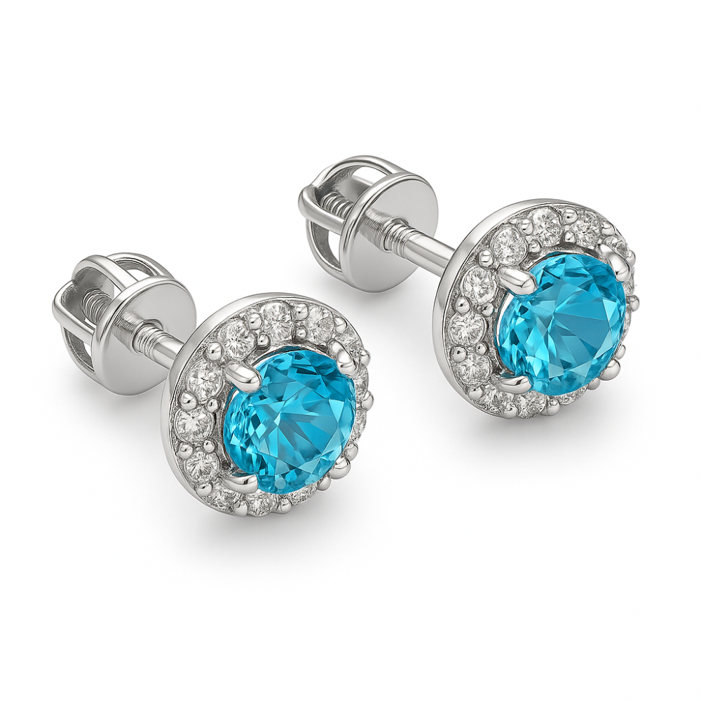 Stříbrné náušnice s bleděmodrými zirkony v halo designu. Průměr náušnic:0,8 cm. Hmotnost náušnic: 2.0 g