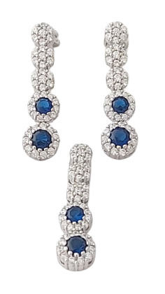 Náušnice jsou tvořeny vertikální linií článků – tři horní články jsou osazeny čirými zirkony, dva spodní dominantní články zdobí modré zirkony lemované jemným třpytem čirých kamenů. Tento design opticky prodlužuje linii ucha a působí velmi elegantně a vyváženě.