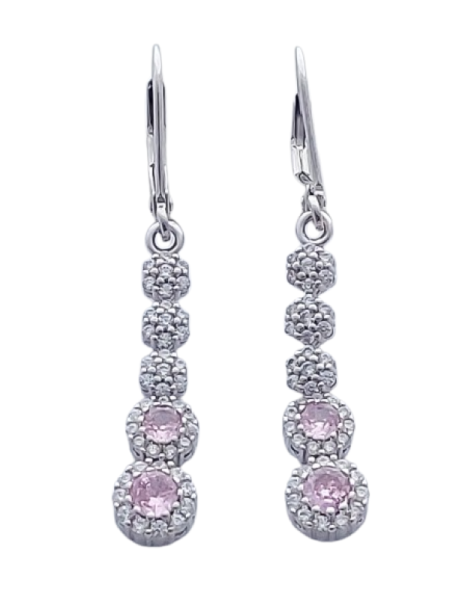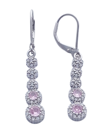 Náušnice jsou tvořeny vertikální linií článků – tři horní články jsou osazeny čirými zirkony, dva spodní dominantní články zdobí růžové zirkony lemované jemným třpytem čirých kamenů. Tento design opticky prodlužuje linii krku a působí velmi elegantně a vyváženě.