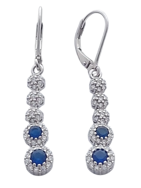Náušnice jsou tvořeny vertikální linií článků – tři horní články jsou osazeny čirými zirkony, dva spodní dominantní články zdobí modré zirkony lemované jemným třpytem čirých kamenů. Tento design opticky prodlužuje linii krku a dodává šperku vyvážený, luxusní vzhled.