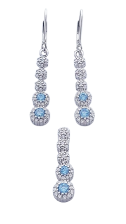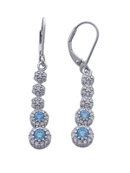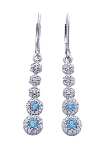Náušnice jsou tvořeny vertikální linií článků – tři horní články jsou osazeny čirými zirkony, dva spodní dominantní články zdobí bleděmodré zirkony lemované jemným třpytem čirých kamenů. Tento design krásně prodlužuje linii krku a dodává šperku lehký, sofistikovaný vzhled.