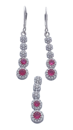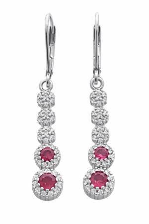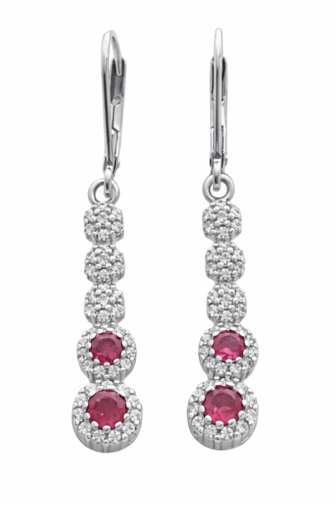 Náušnice jsou tvořeny vertikální linií článků – tři horní články jsou osazeny čirými zirkony, dva spodní dominantní články zdobí červené zirkony lemované jemným třpytem čirých kamenů. Tento design krásně prodlužuje linii krku a dodává šperku královský vzhled.