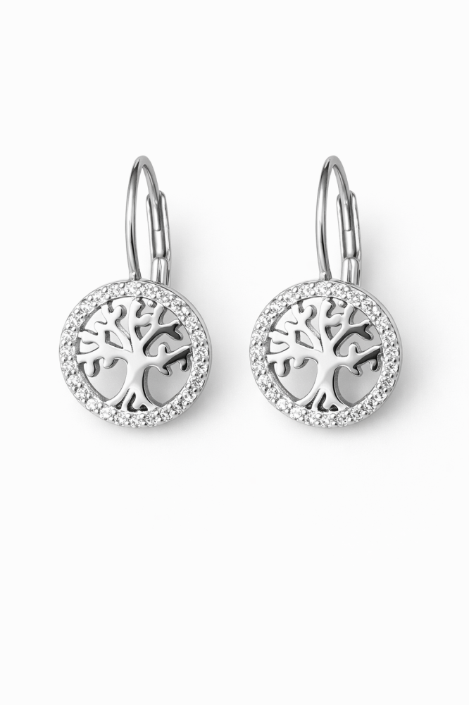 Tyto stříbrné náušnice Strom života spojují jemnou eleganci s hlubokou symbolikou. Motiv stromu života představuje sílu, stabilitu, růst a propojení s přírodou i vlastními kořeny. Precizně vyřezaný strom je zasazen do kruhu lemovaného čirými zirkony, které náušnicím dodávají jemný, luxusní třpyt.