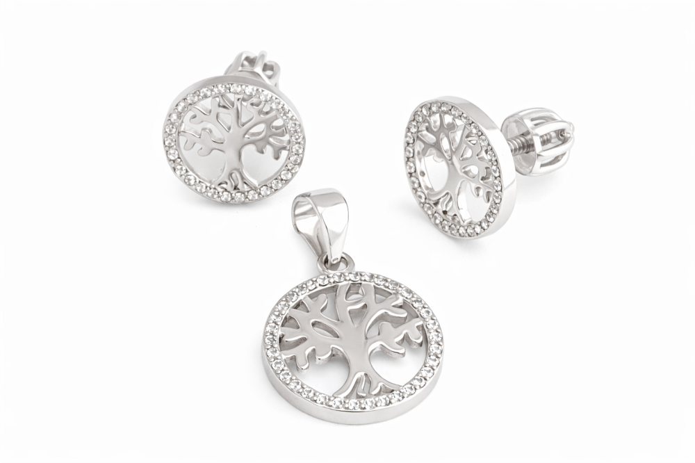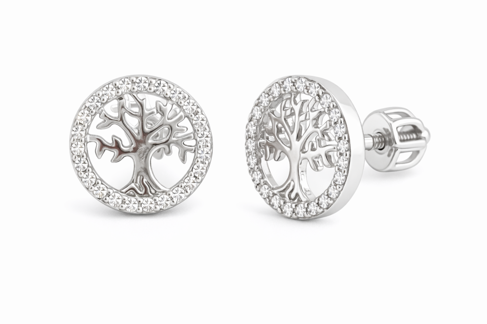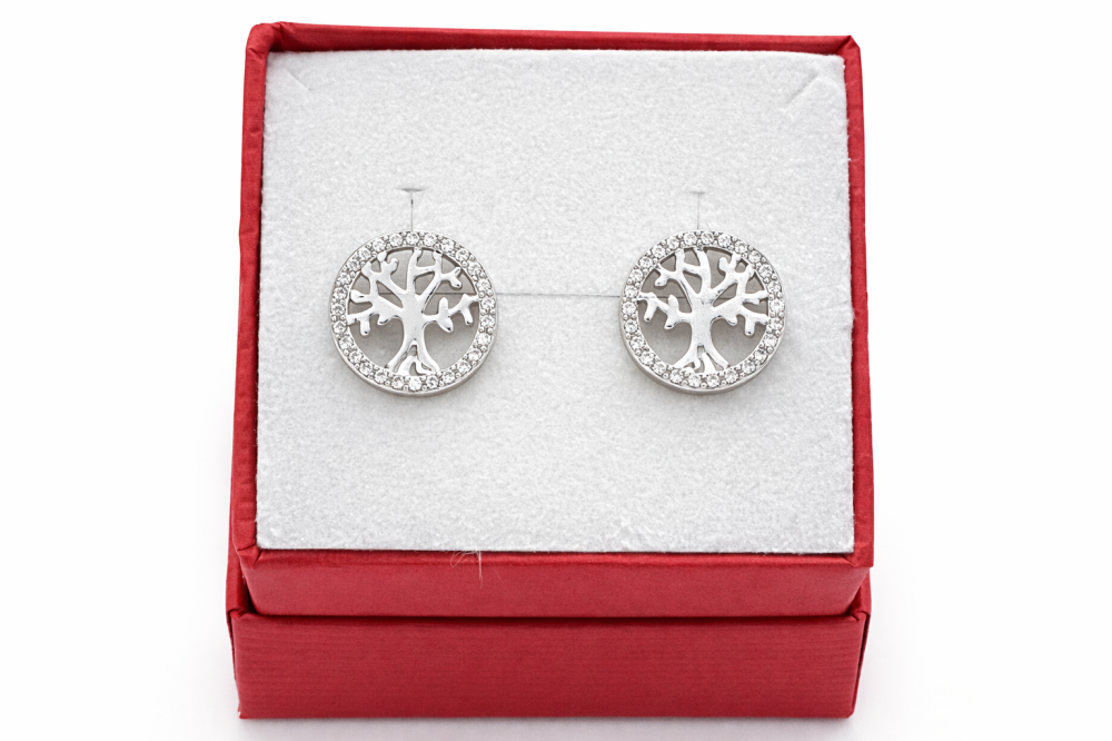 Precizně zpracovaný strom je zasazen do kruhu jemně osázeného čirými zirkony, které dodávají náušnicím elegantní třpyt a luxusní vzhled. Kontrast hladkého stříbra a jiskřivých kamenů vytváří vyvážený design, který působí klidně, ale zároveň velmi výrazně.